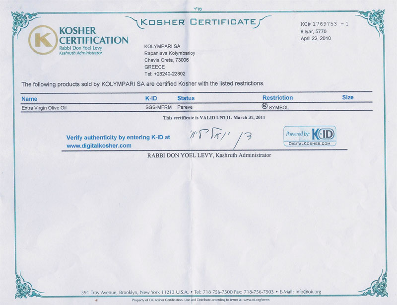 Our famous Kolympari S.A. Extra Virgin Olive Oil is certified Kosher