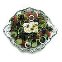 Wash tomatoes, cucumbers, parsley and green pepper. Cut all of them into pieces and put in a salad bowl. Add onion cut into thin rings and olives. Season with salt and oregano, pour over the dressing with olive oil and vinegar and mix. At the end place feta cheese on top of the salad